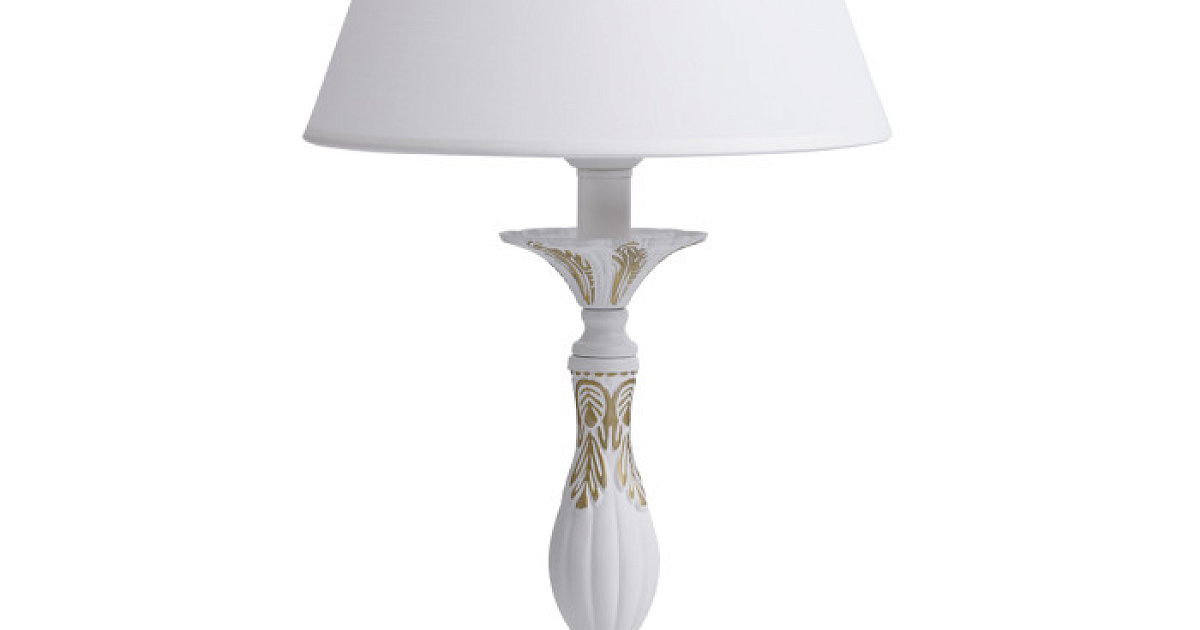 Арматура настольной лампы выполнена из комбинации сплавов металлов и обработана по технологии ручного окрашивания: основной защитный слой белого матового цвета, затем вручную окрашены выступающие части орнамента. Основание светильника выполнено из сплава железа по технологии прессования. Стержень и декоративная розетка выполнены из сплава алюминия с цинком по технологии художественного литья в кокиль под давлением.