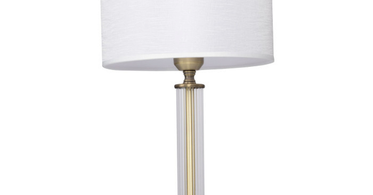 Металлическое основание настольной лампы гальванизировано в цвет античной бронзы. Традиционный источник света закрыт двухслойным текстильным абажуром белого цвета с термостойким акрилом внутри. Абажур отделан кантом и прошит. Светильник декорирован элементами из прозрачного стекла вытянутой формы.