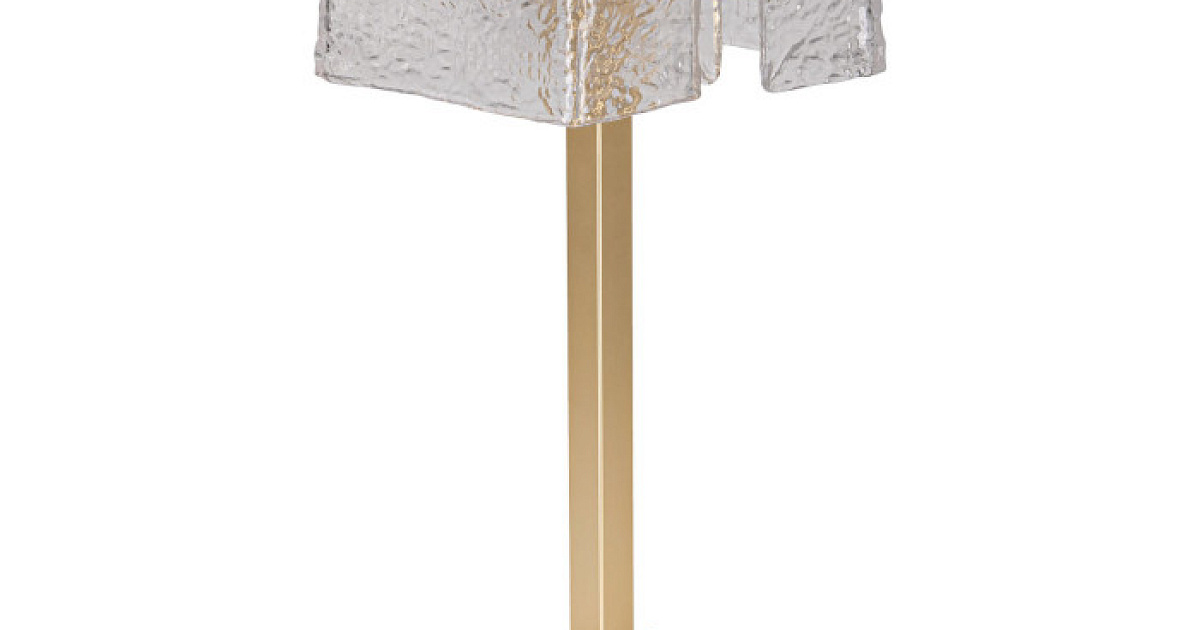 Металлическое основание настольной лампы гальванизировано в цвет золота. Настольная лампа декорирована плафоном из прозрачного фактурного стекла.