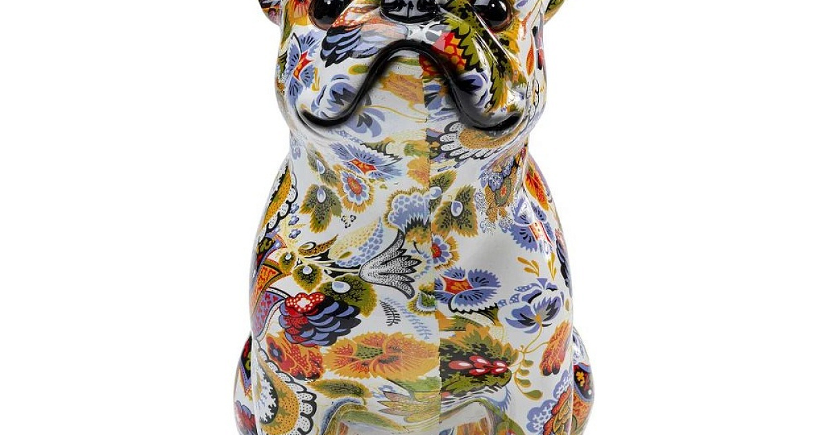 Фигурка сидящей собаки с красочной росписью, которая превращает декоративную скульптуру в маленькое попсовое произведение искусства. Идея подарка из прочного искусственного камня для любителей собак и всех, кто хочет украсить свой дом необычными скульптурами и декоративными фигурками.
