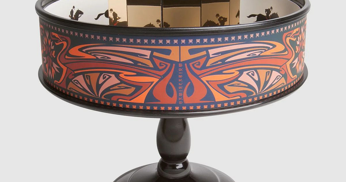 Эта оптическая игрушка в стиле модерн состоит из прочного металлического основания, на котором плавно и сбалансированно вращается барабан с 12 зеркалами, создающими оптическую иллюзию благодаря отражению изображений. С оформлением, основанным на художественном стиле, известном как модернизм или ар-нуво конца 19-го - начала 20-го века.
