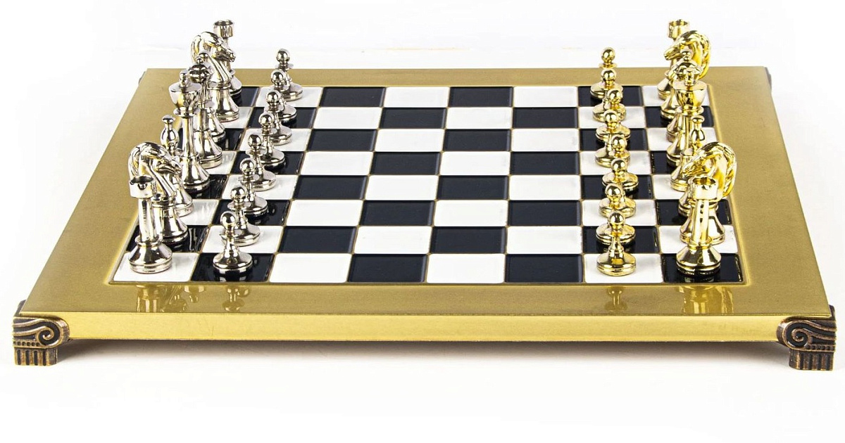 Ощутите элегантность и традиции классических металлических шахмат Staunton от Manopoulos. Этот набор среднего размера состоит из замысловато оформленных золотых и серебряных шахматных фигур на бронзовой шахматной доске размером 36х36 см, что является данью уважения вечному дизайну Staunton, почитаемому шахматистами во всем мире.