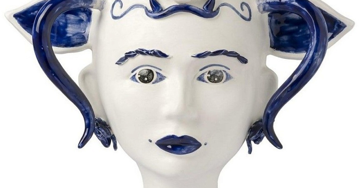 Эксклюзивная ваза в форме головы женщины. Изготовлена из керамики белого и синего цвета, все украшения нанесены и расписаны вручную, что делает каждое изделие уникальным.