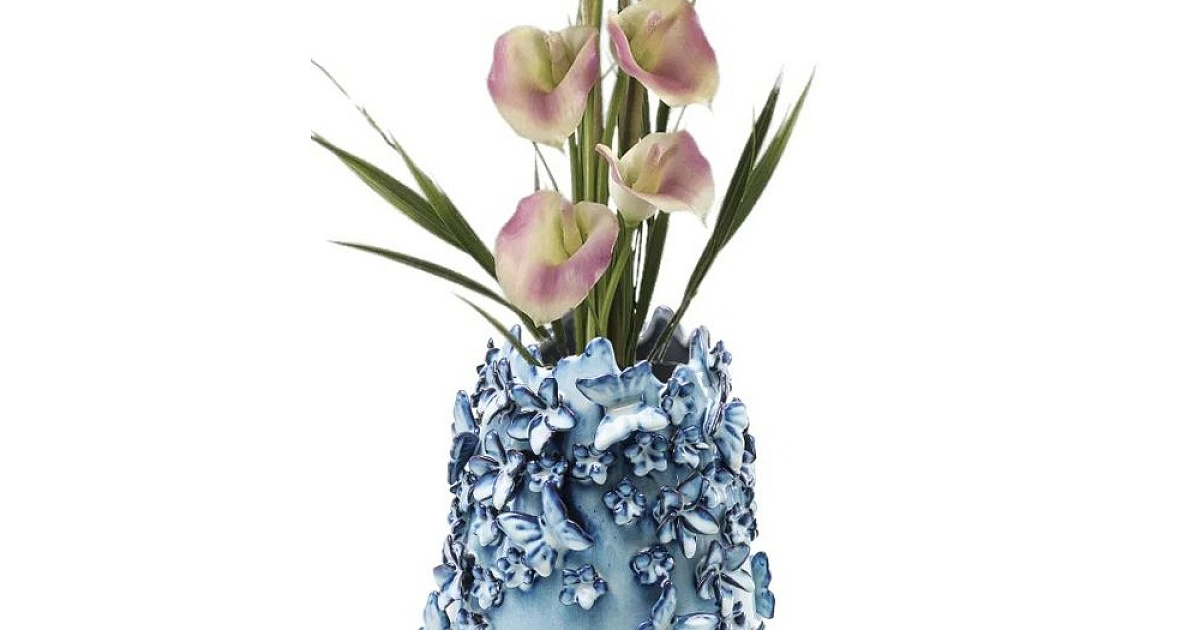 Сказочная декоративная ваза свежего светло-голубого цвета с бабочками в качестве красивого украшения. Сочетает в себе изысканно-романтический шарм с современным оттенком. Идеально подходит для современного декора.