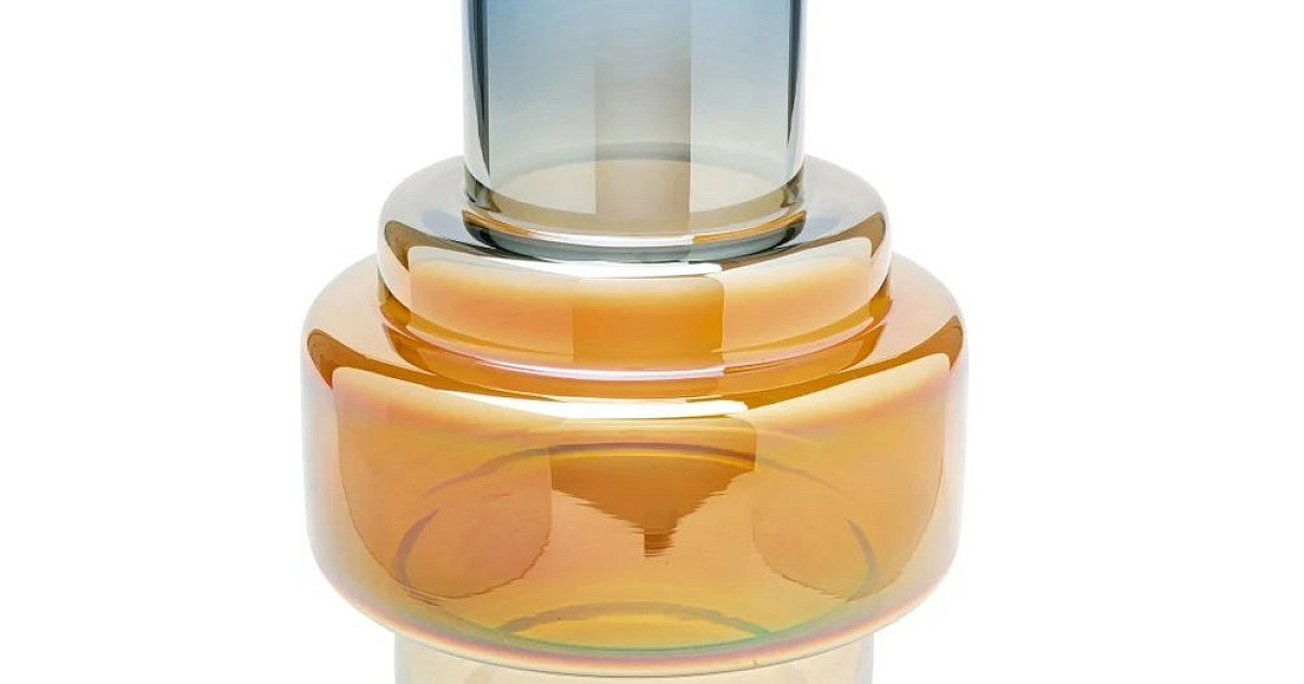 Стеклянная ваза цилиндрической формы нежно-оранжевого и серо-голубого цветов.